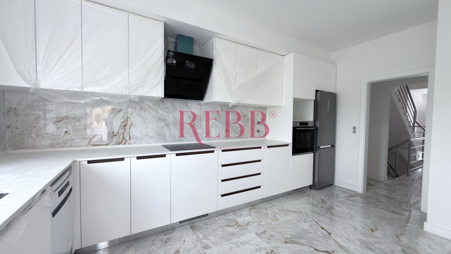 A cozinha encontra-se totalmente equipada com eletrodomésticos encastrados, combinando funcionalidade com uma estética moderna e organizada.
